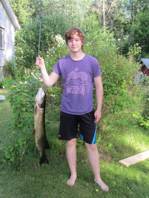 Han fick kämpa ett bra tag innan han fick upp den ur vattnet men han lyckades på egen hand. Gäddan röktes på grillen och på resterna blev det en jättegod fiskpudding till skirat smör och färskpotatis.